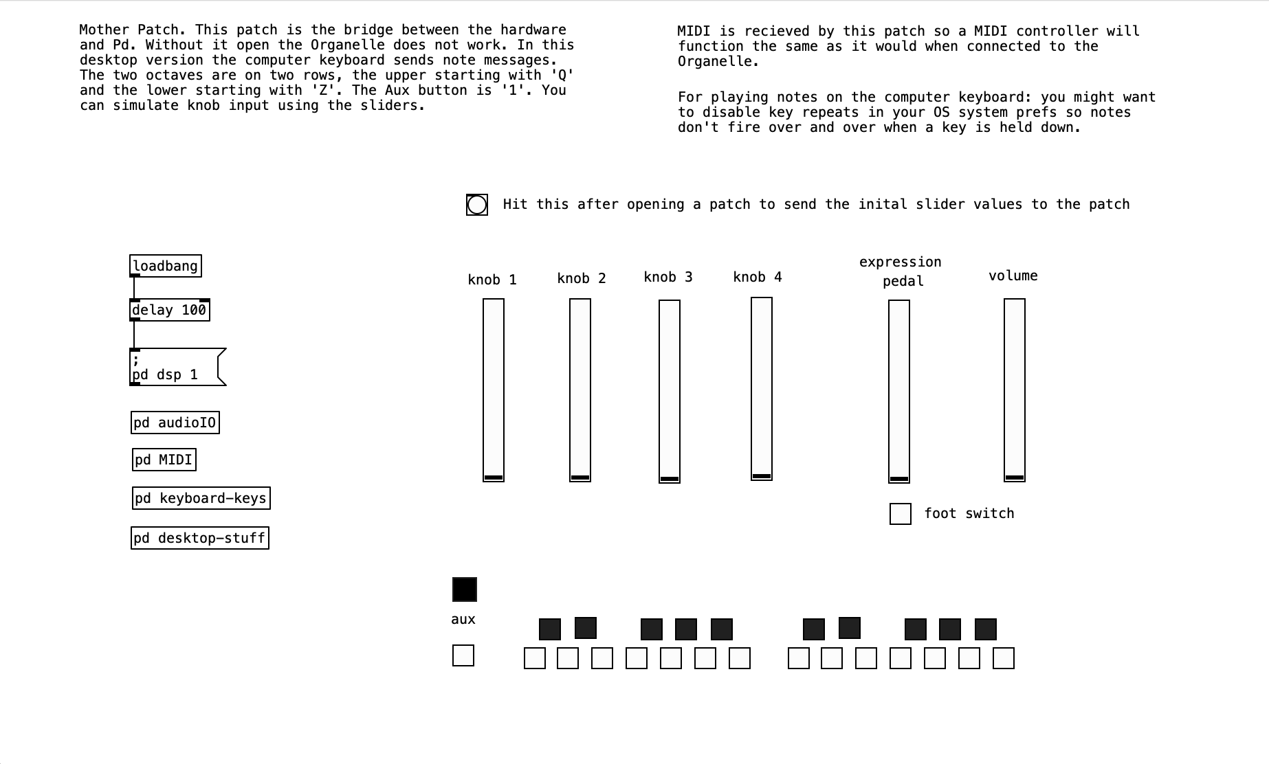 Back to Constant Gardener. This patch uses knob 1 to control the speed (or time element) of the re-synthesis. Knob 2 controls the pitch of the resynthesis. The third knob controls the balance between the dry audio input to the Organelle with the processed (resynthesized) sound. The final knob controls how much reverb is added to the sound. The aux button (or foot pedal) is used to turn the phase vocoder resynthesis on or off.