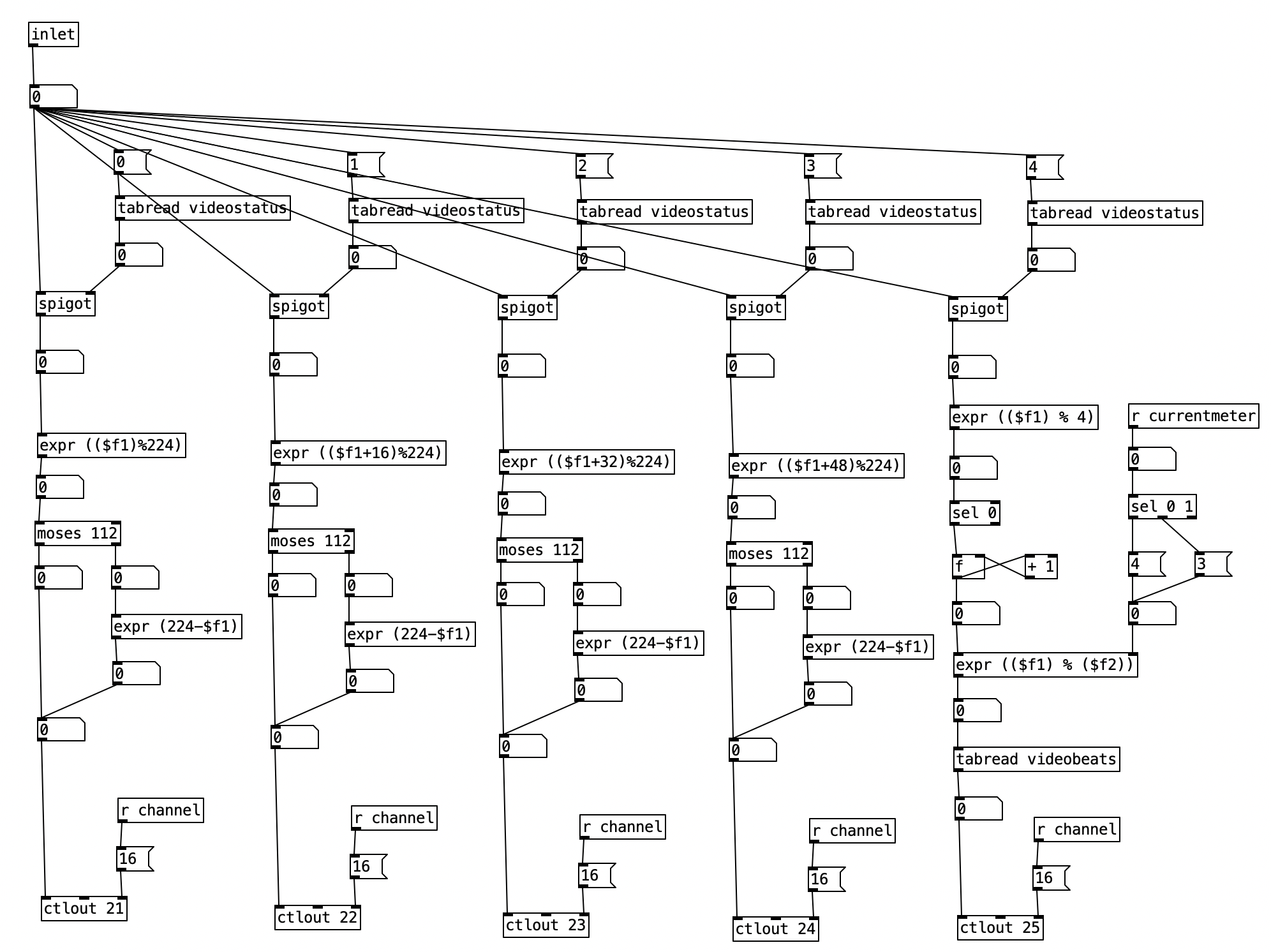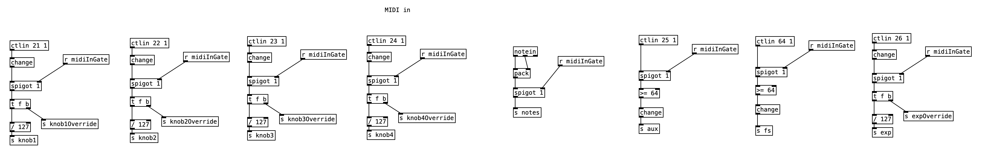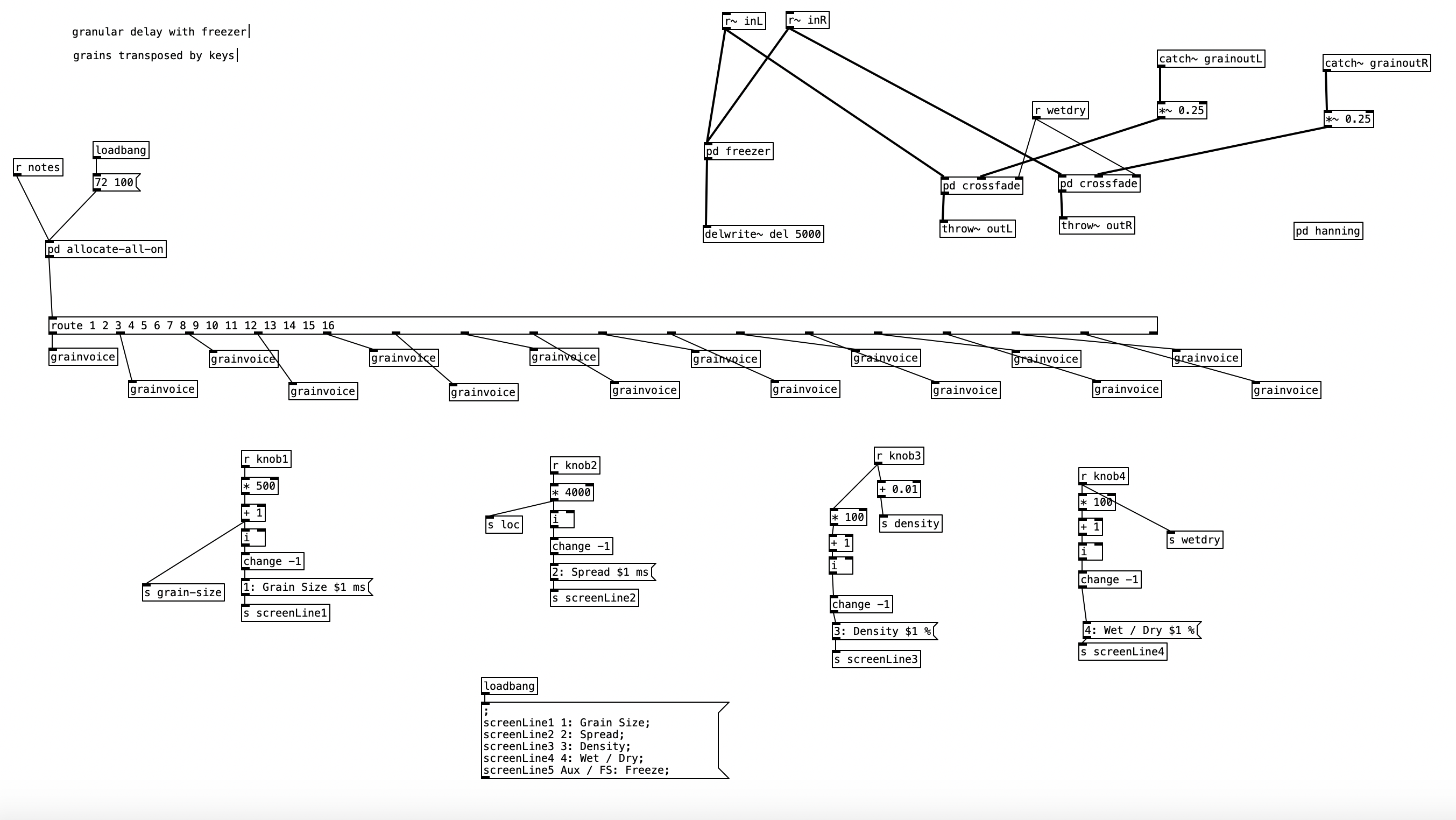 When the value of reverb-amt is recieved, it is sent to a subroutine called cg-dw. I’m not sure why the author of the patch used that name (perhaps cg stands for constant gardener), but this subroutine basically splits the signal in two, and modifies the value the will be returned out of the left outlet to be the inverse of the value of the right outlet (that is 1 – the reverb amount). Both values are passed through a low pass filter with cutoff frequency of 5 Hz, presumably to smooth out the signal.