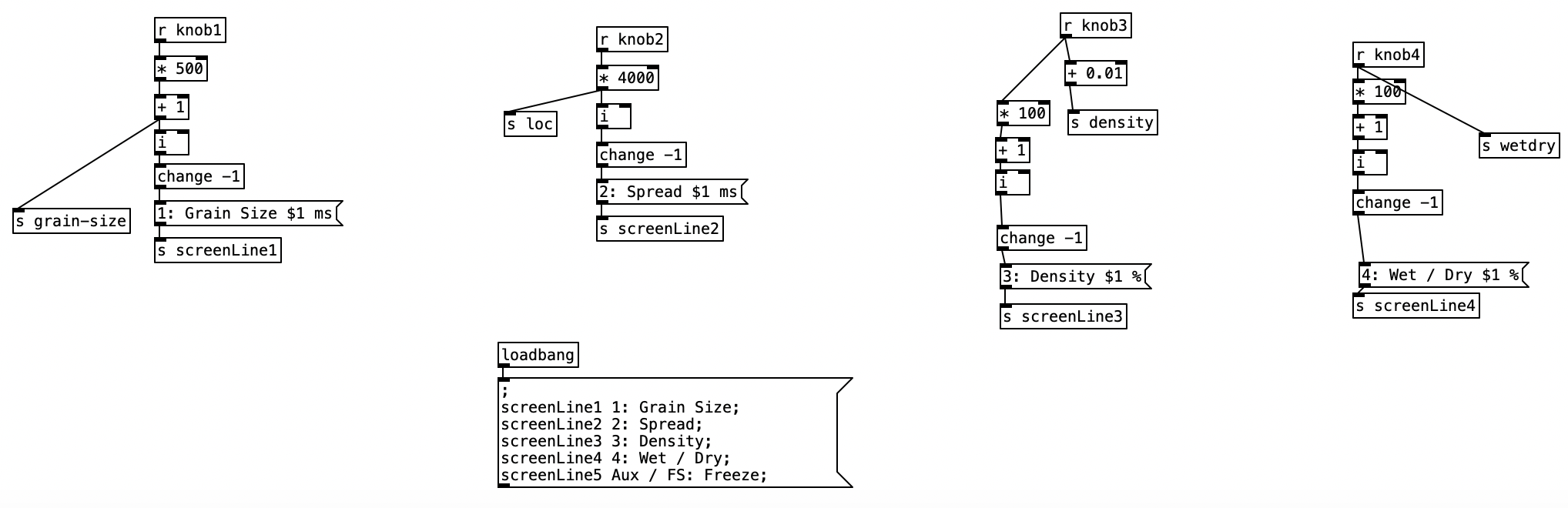 The phase vocoder part of the algorithm is sufficiently difficult such that I won’t attempt to go through it here, rather I will go through the reverb portion of the patch. As stated previously, knob four controls the balance between the dry (non-reverberated) and the reverberated sound. Thus value is then sent to the screen as a percentage, and is also sent to the variable reverb-amt using a number from 0 to 1 inclusive.