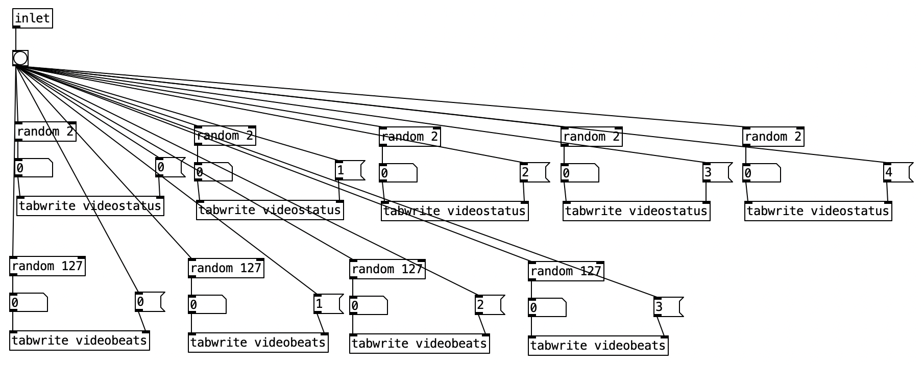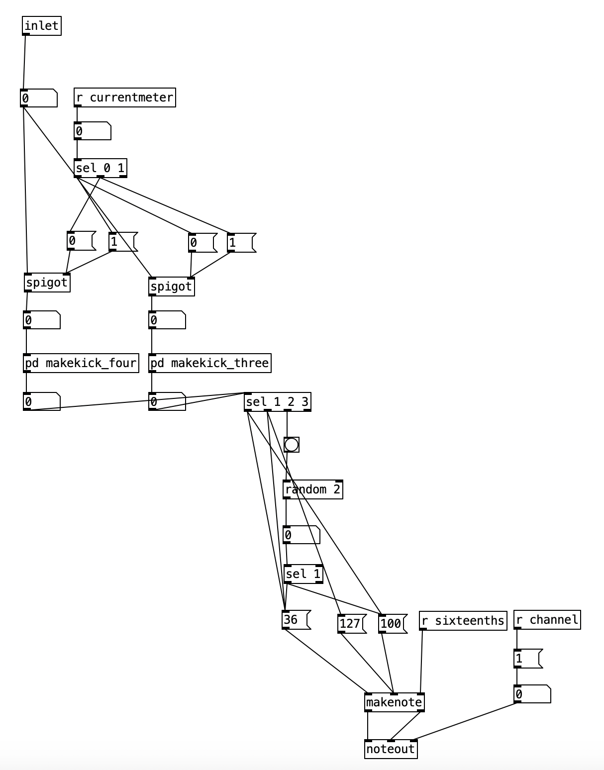 Finally we get to the reverb subroutine itself. The object that does most of the heavy lifting in this subroutine is rev~ 100 89 3000 20. This is a stereo input, four output reverb unit. Accordingly the first two inlets would be the left and right input. The other four inlets are covered by creation arguments (100 89 3000 20). These four values correspond to: output value, liveness, crossover frequency, and high frequency dampening. The output value is expressed in decibels. When expressed in this manner we can think of a change of 10 dB as doubling or halving the volume of a sound. We often consider the threshold of pain (audio so loud that it is physically painful to us) as starting around 120 dB. Thus, 100 dB, while considered to be loud, is 1/4 as loud as the threshold of pain. The liveness setting is really a feedback level (how much of the reverberated sound is fed back through the algorithm). A setting of 100 would yield reverb that would go on forever, while the setting 80 would give us short reverb. Accordingly, 89 gives us a moderate amount of reverb.
